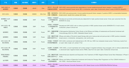 在乳腺癌领域,九游会创新产品相关研究共入选1项口头报告、1项简短口头报告、8项壁报和1项电子壁报,共11项研究。吡咯替尼、达尔西利、阿得贝利单抗、瑞康曲妥珠单抗等新老创新药物,均有多篇研究入选,展现出九游会医药在乳腺癌领域多年深耕的丰硕成果。